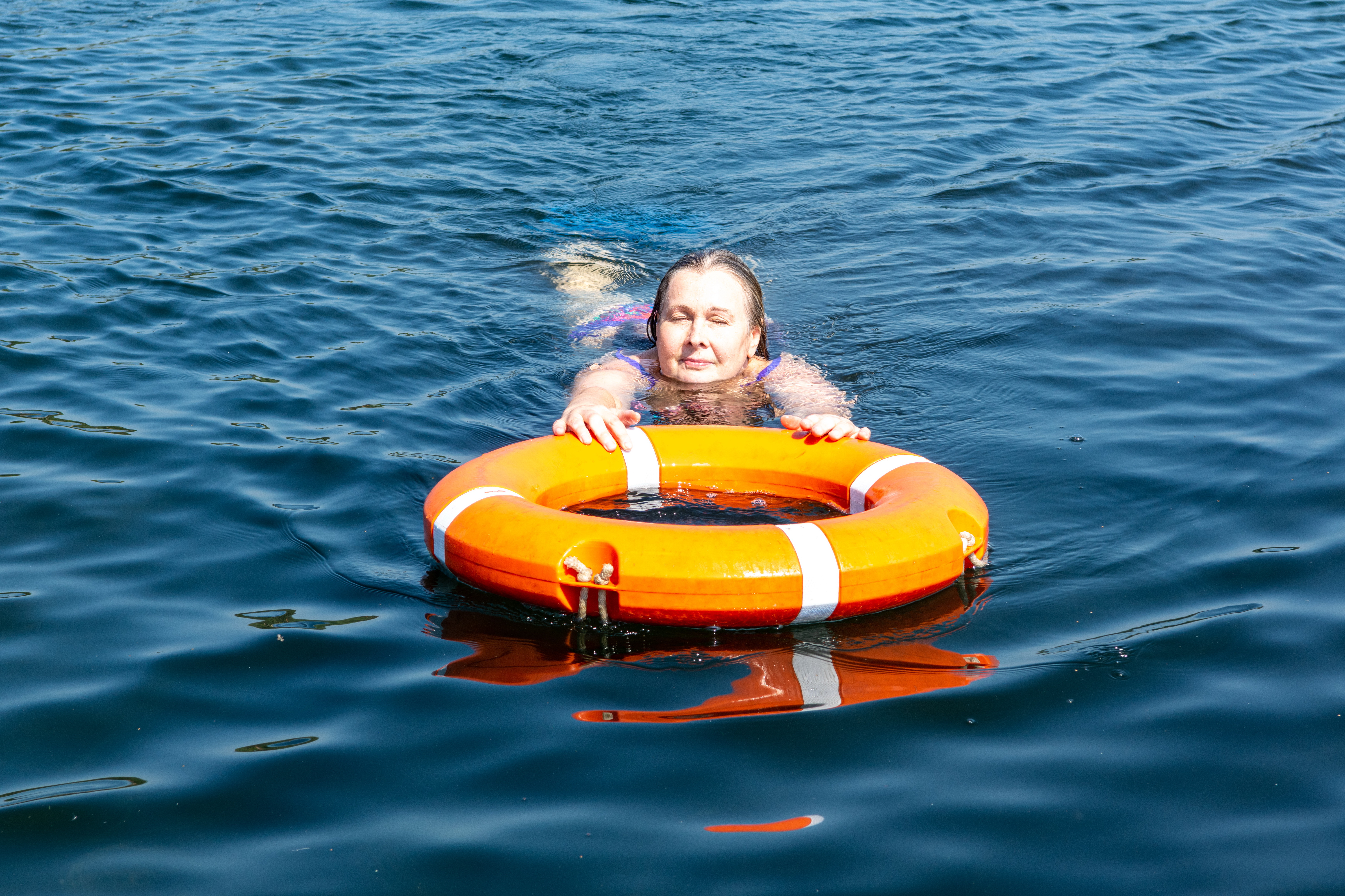 Take it out of the plastic, try it on, and learn how to adjust it for a snug fit. Then, test it in the water. Make sure it supports you and keeps your mouth and head clear of the water with no effort on your part.